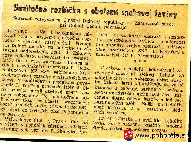 8. marec 1956 bol strašný a pamätný pre Pohorelú. Asi o 9:30 hod. za strašného hukotu zosunula sa vo Vajskovej doline nad Dolnou Lehotou veľká snehová lavína, ktorá zmietla robotnícku chatu aj s lesnými robotníkmi . zahynulo 16 ľudí - 9 lesných robotníkov z Pohorelej a 7 z Telgártu. Podľa záznamov v obecnej kronike z roku 1956 lavína bola tak obrovská, že brala stromy i s koreňmi, ba niektoré stromy boli poštiepané tlakom a silou lavíny na triesky. Po lesnej chate, v ktorej sa nachádzalo 16 lesných robotníkov a 2 kuchárky, neostalo ani pamiatky: - Do hľadania mŕtvych bolo zapojené vojsko (posádky z Brezna, z Banskej Bystrice a Martina), požiarnici a brigádnici. Obrovská masa snehu bola tak zbitá do seba, že lopaty ťažko išli do snehu. Hľadanie sa začalo ešte v deň nešťastia. Do 11. marca našli len 9 mŕtvych obetí. Dňa 12. marca 1956 bol v Brezne štátny pohreb a smútočná rozlúčka s obeťami snehovej lavíny za účasti vládnych predstaviteľov. Rozlúčky sa zúčastnilo podľa odhadu asi 15.000 ľudí z celého okolia. Po prevoze mŕtvych do Pohorelej boli pochovaní podľa cirkevných obradov. Pohrebu sa zúčastnila celá obec i mnoho ľudí z okolitých dedín. Obrad vykonal rožňavský biskup. Pochovaní boli do spoločného hrobu v miestnom cintoríne. V roku 1995 pohorelskí aktivisti a športoví nadšenci spolu so zamestnancami Lesov SR – Ing. Rudolf Galgoň, PaedDr. Lukáč Janoška, Jozef Kanoš, Ján Pompura, Ing. Ján Puťoš a Ján Tlučák - prvý krát zrealizovali myšlienku pripomenutia si tejto smutnej udalosti a uctenia si pamiatky obetí, ako aj ťažkej práce lesných robotníkov. Na ich počesť sa v Pohorelej koná každoročne spomienkový deň. Súčasťou spomienkového dňa je každoročne i Memoriál lesných robotníkov – majstrovstvá Pohorelej v nohejbale trojčlenných družstiev. V roku 2006 OZ Opora Pohorelá zabezpečila údržbu spoločného pomníka v cintoríne. Pri príležitosti 50. výročia si uctil obete lavínového nešťastia aj prezident Slovenskej republiky Ivan Gašparovič spolu s generálnym riaditeľom podniku Lesy Slovenskej republiky Igor Olajec priamo v Kulichovej doline nad Dolnou Lehotou pri Mohyle obetiam tragického lavínového nešťastia z roku 1956. Konal sa tam pietny akt za účasti pozostalých, obyvateľov a predstaviteľov obcí Pohorelá, Telgárt a Dolná Lehota, záchranárov a lesníkov. Prezident Ivan Gašparovič položil veniec pri pamätníku obetiam nešťastia a odhalil pamätnú tabuľu. - J.Pompura -
