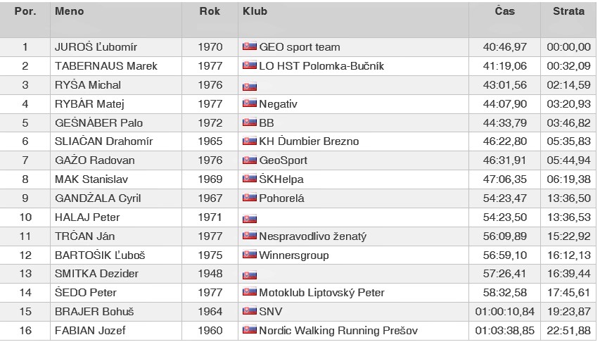 Cieľom ako prvý prebehol Vlado Jambrich z Horskej chaty pod Kraľovou hoľou, ktorý obhájil minuloročné víťazstvo s časom 36:22. Ako prvá žena dobehla tento rok len 19-násť ročná Rebeka Gabčíková z Kremnice s časom 43:15 !!!, ktorý je zároveň novým ženským rekordom. Minuloročný ženský rekord prekonali až tri ženy.